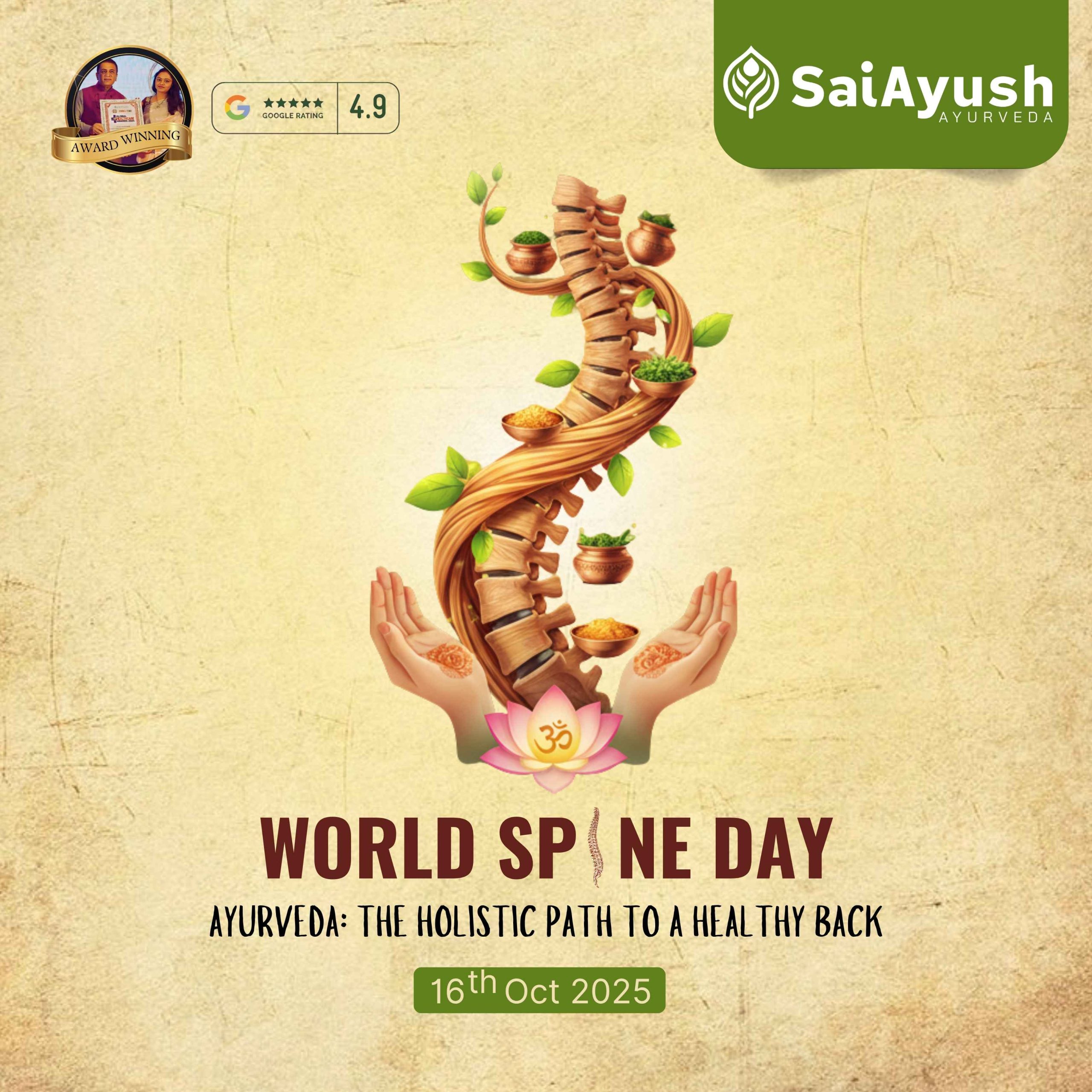 This World Spine Day (16th Oct 2025), heal naturally with Ayurvedic therapies like Panchakarma, Abhyanga, Kati Basti & Yoga at Sai Ayush Ayurveda Hospital, Hyderabad.